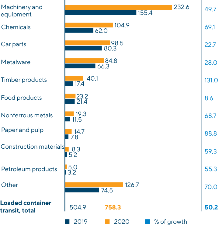 Sources: Russian Railways, Company data Across all commodity groups, the highest increase in 2020 was seen in the container transportation of nonferrous metals (+81.1%), machinery and equipment (+32.2%), timber products (+25.3%), and food products (+19.0%).